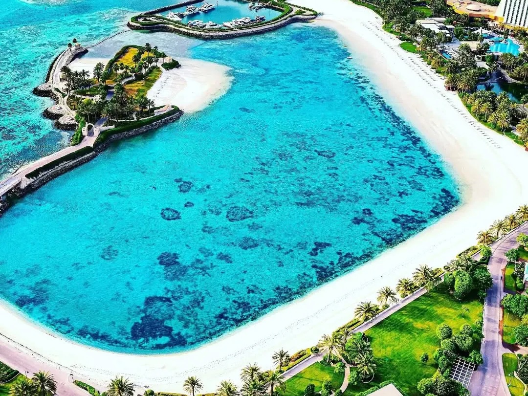 The beach’s tranquil atmosphere is further enhanced by beautifully maintained lawns, palm-fringed walkways, and uninterrupted views of the Arabian Gulf. The pristine white sand beach and its shimmering lagoon sit beside green open spaces, a jogging trail, a flamingo pond, tennis courts, and two outdoor pools, creating an inviting ambience perfect for families, couples, and leisure seekers.